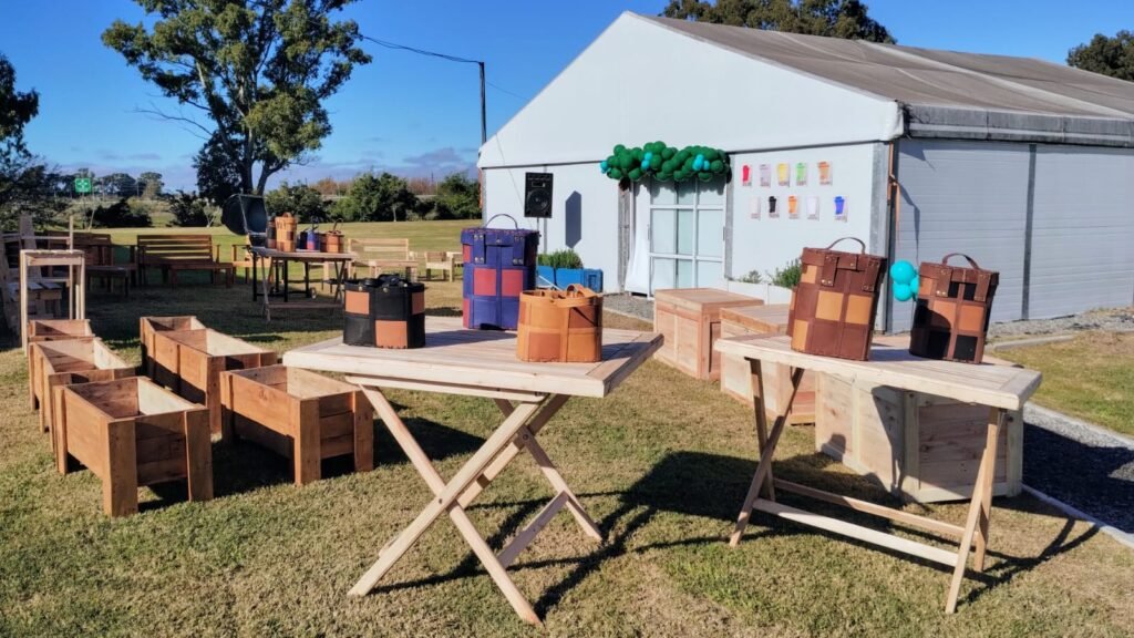 La producción consistió en dos juegos de sillones con mesas ratonas, seis maceteros, seis baúles de madera, cuatro juegos de puff con mesas para niños, seis mesas plegables, bolsos materos de cuero, parrillas y chulengos.